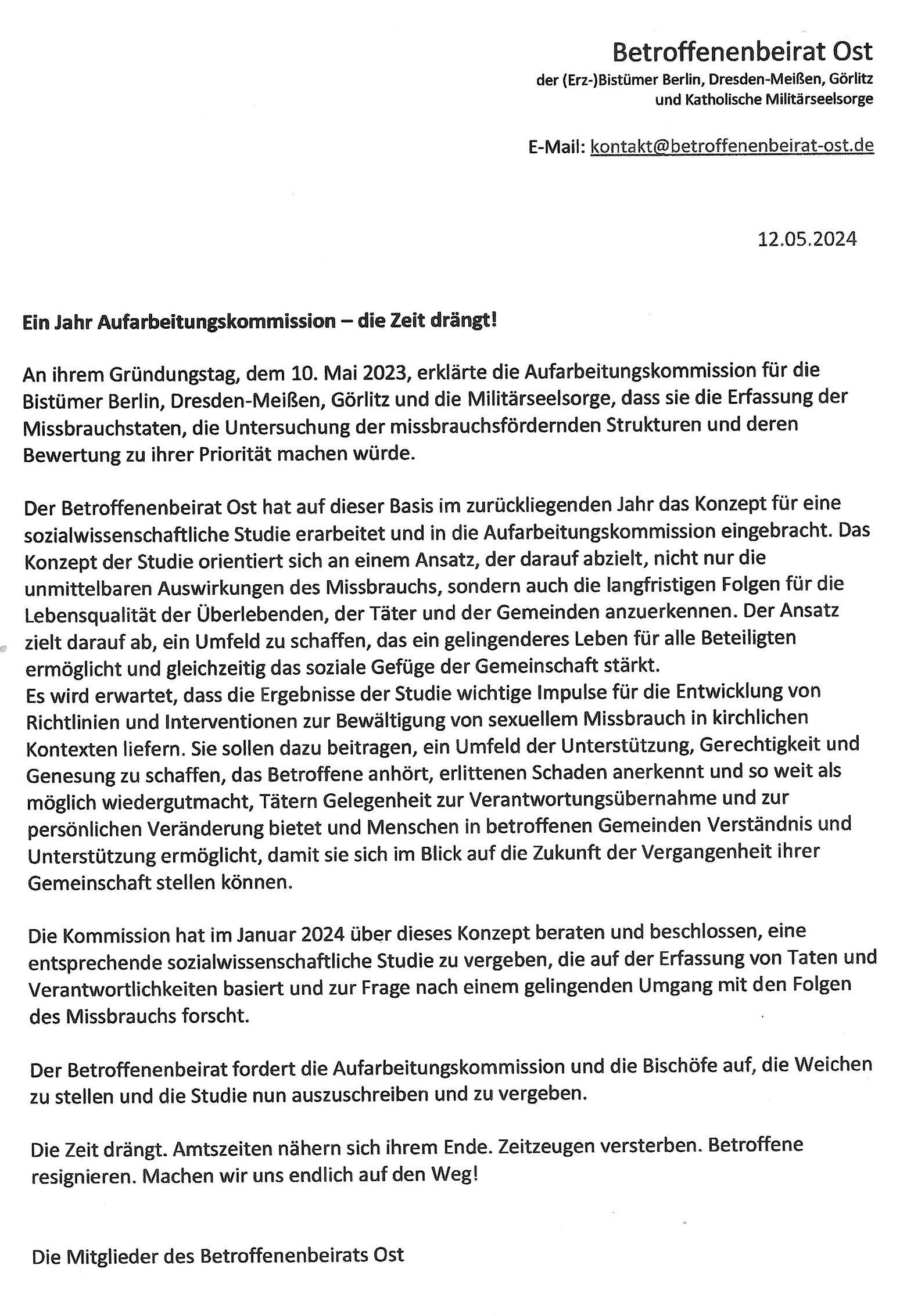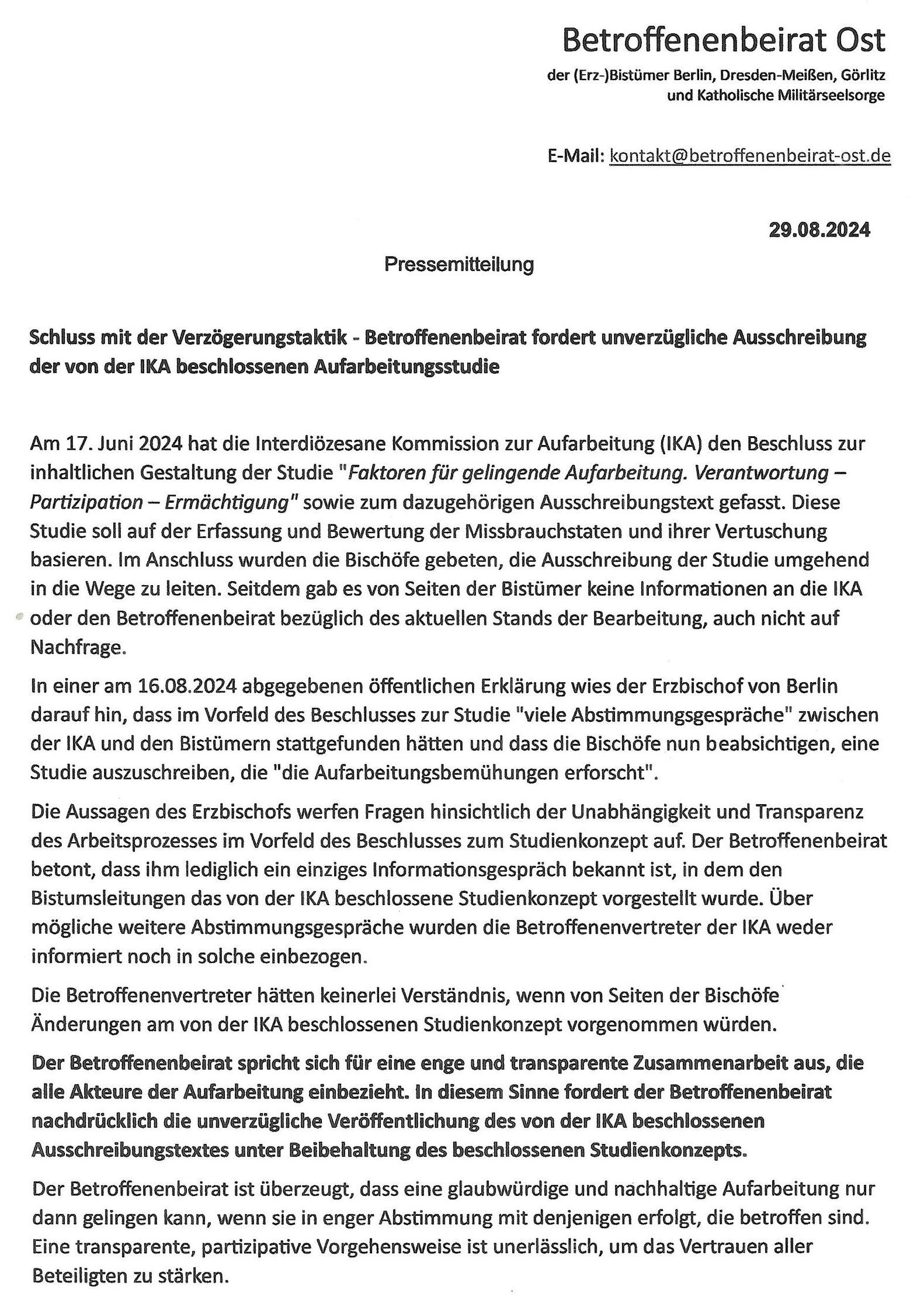 Auszug: Die Betroffenenvertreter in der Aufarbeitungskommission IKA haben in der Arbeitsgemeinschaft Gutachten/Studie ein Konzept für die wissenschaftliche Erfassung und Bewertung des sexuellen Missbrauchs in den (Erz)Bistümern Berlin, Dresden-Meißen und Görlitz erarbeitet. [...] Der Betroffenenbeirat dankt allen, die sich an der Seite der Betroffenen für die Freigabe der Studie eingesetzt haben. Unser besonderer Dank gilt der Betroffeneninitiative Ost und dem Katholikenrat Dresden-Meißen, die uns immer wieder bestärkt und ermutigt haben. Wir danken auch den Fachstellen in den Bistümern, die das Vorhaben unterstützen. Der Betroffenenbeirat Ost fordert die (Erz)Bischöfe von Berlin, Dresden-Meißen und Görlitz auf, die wissenschaftliche(n) Studie(n) nun zügig öffentlich auszuschreiben und ein transparentes Vergabeverfahren durchzuführen.