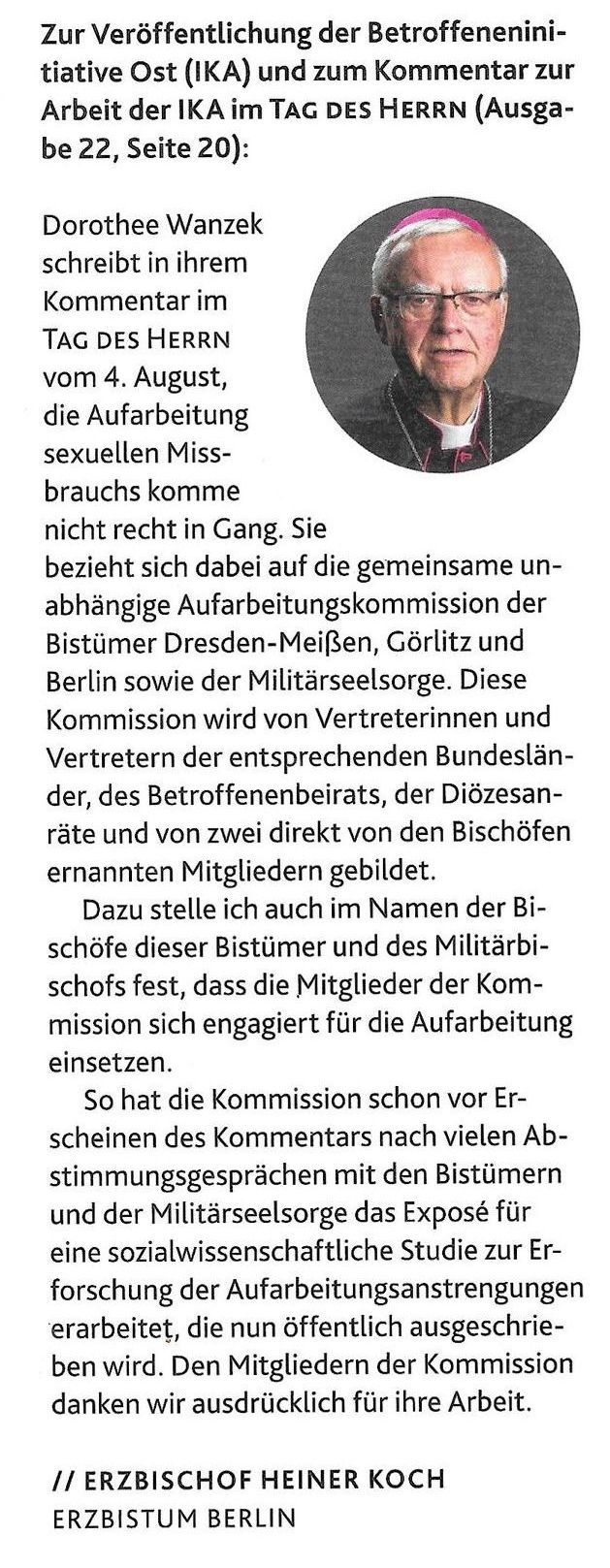 Die Betroffeneninitiative Ost positioniert sich zum Interview von Generalvikar Kollig (Erzbistum Berlin):