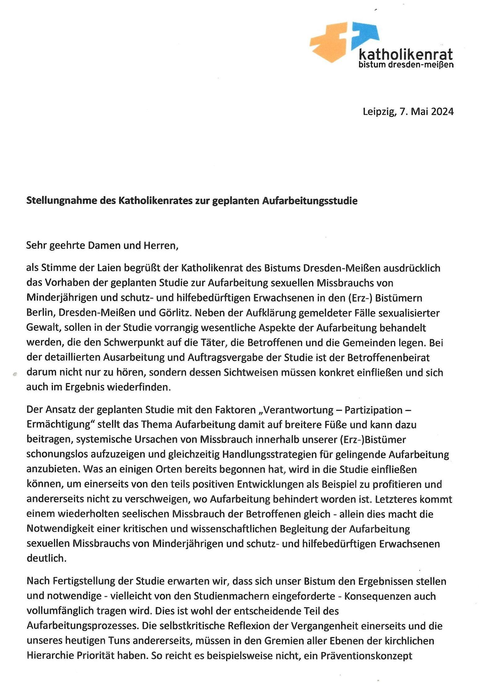Meißen, Görlitz und die Katholische Militärseelsorge (IKA) Betroffene angemessen beteiligen und die Interessen Betroffener bei der Aufarbeitung berücksichtigen wird." (Pressemitteilung des Betroffenenbeirats Ost)