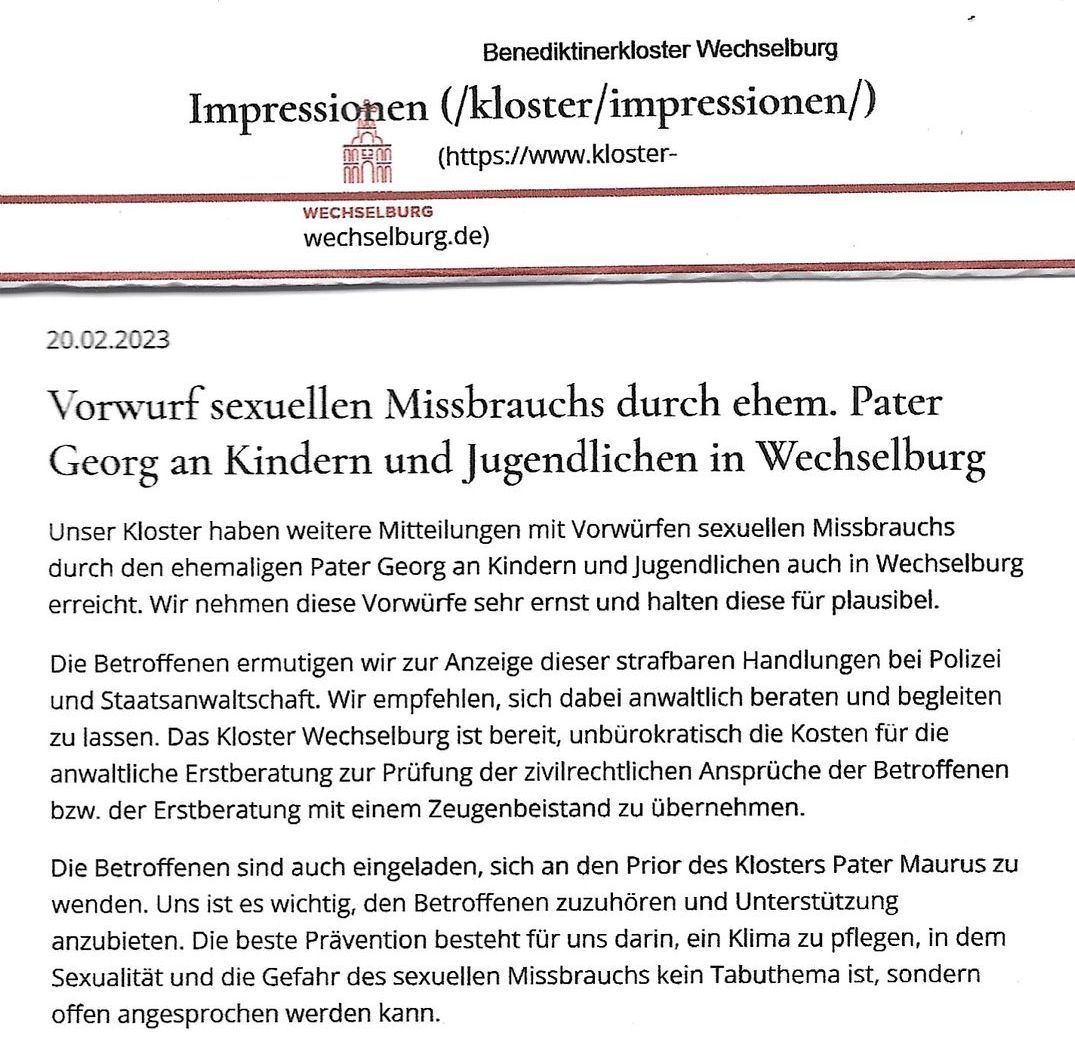 Pater Georg soll im Jahr 2005 vor einer Schulklasse einen "sehr jungen Internatsschüler" auf den Schoß genommen und gestreichelt haben, so Lamprecht. Unmittelbar nach dem Vorfall sei er nach Wechselburg in Sachsen versetzt worden. Dort leitete er nach Angaben des Klosters das Jugend- und Familienhaus, war als Jugendseelsorger, Finanzverwalter und Sprecher der Pfarrgemeinde tätig.